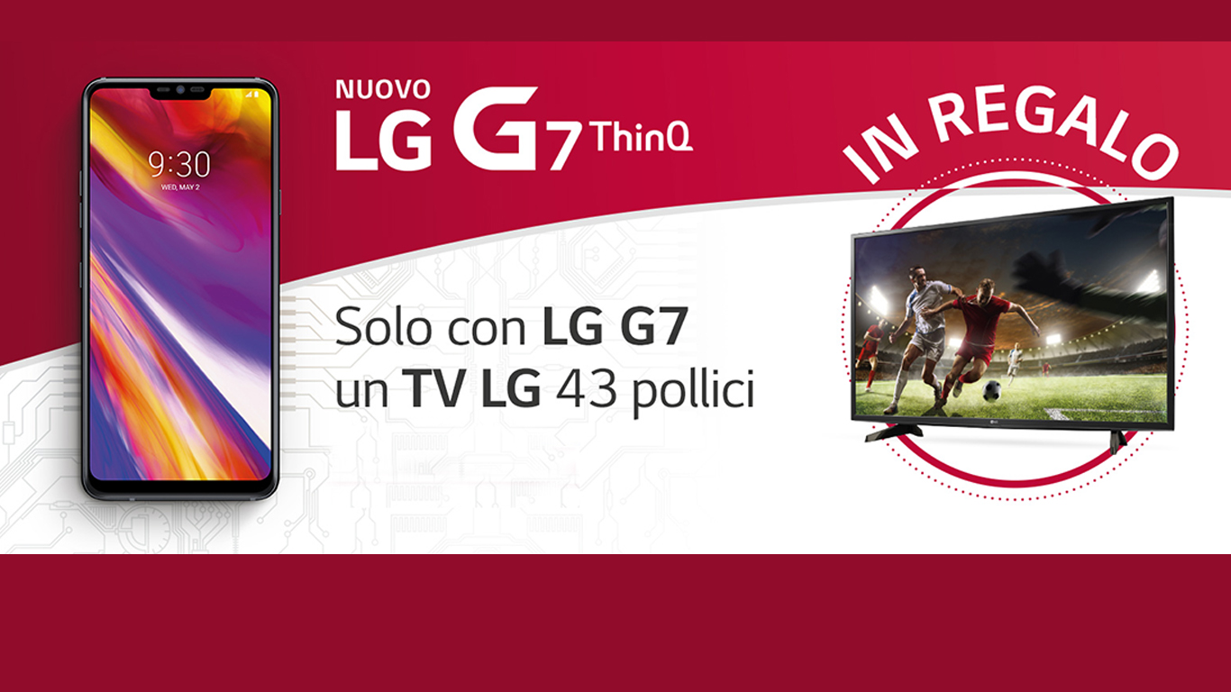 Dal 7 al 21 Giugno 2018, tramite l’offerta LG For You, acquistando un LG G7 ThinQ, si riceverà in omaggio un TV LG Full HD da 43 pollici del valore di 429€.