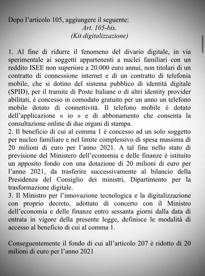 Ufficialmente denominato “Kit di digitalizzazione” ed inserito nella manovra finanziaria 2021 dalla maggioranza, lo “smartphone di cittattinanza” sembra ormai essere quasi realtà. Lo scopo sarà quello di ridurre il divario digitale e sarà erogato solo a nuclei famigliari con reddito ISEE inferiore a 20.000€, a soggetti non titolari di abbonamenti internet (fisso/mobile) e saranno esclusi quelli che hanno già ottenuto il bonus banda larga.