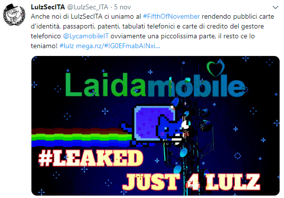 Lo scorso 5 novembre il gruppo di hacker LulzSec ha esordito con un tweet che ha allarmato i clienti dell’operatore virtuale. Spiegavano, in sostanza, di aver messo le mani su una certa quantità di dati sensibili (carte di identità, codici fiscali, carte di credito e quant’altro), nonché sulle credenziali di accesso di diversi rivenditori di Lycamobile, e di aver pubblicato tutto in chiaro sulla piattaforma MEGA, a disposizione di chiunque.