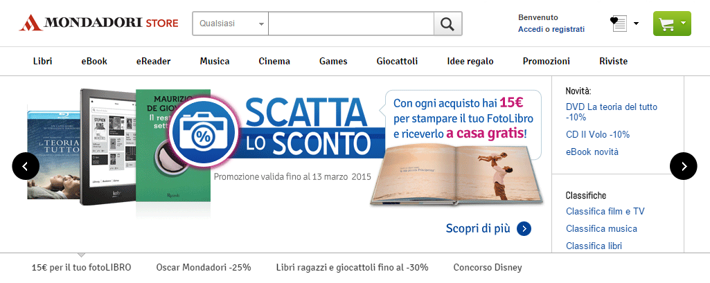 Ordinando subito un libro, film, game o qualsivoglia prodotto sullo store di Mondadori, ricevi 15€ spendibili unicamente nella stampa di un fotolibro in cui conservare le foto più belle. E la consegna è gratis!