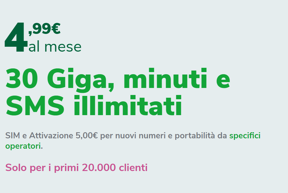 Very 4,99 offre minuti ed SMS illimitati verso tutti, oltre a 30GB (4G limitato in velocità a 30 Mega in download e upload) di traffico dati incluso a 4,99€ al mese – sarà attivabile solo dai primi 20.000 clienti. La SIM costa 5€ una tantum, mentre è gratuita la spedizione.