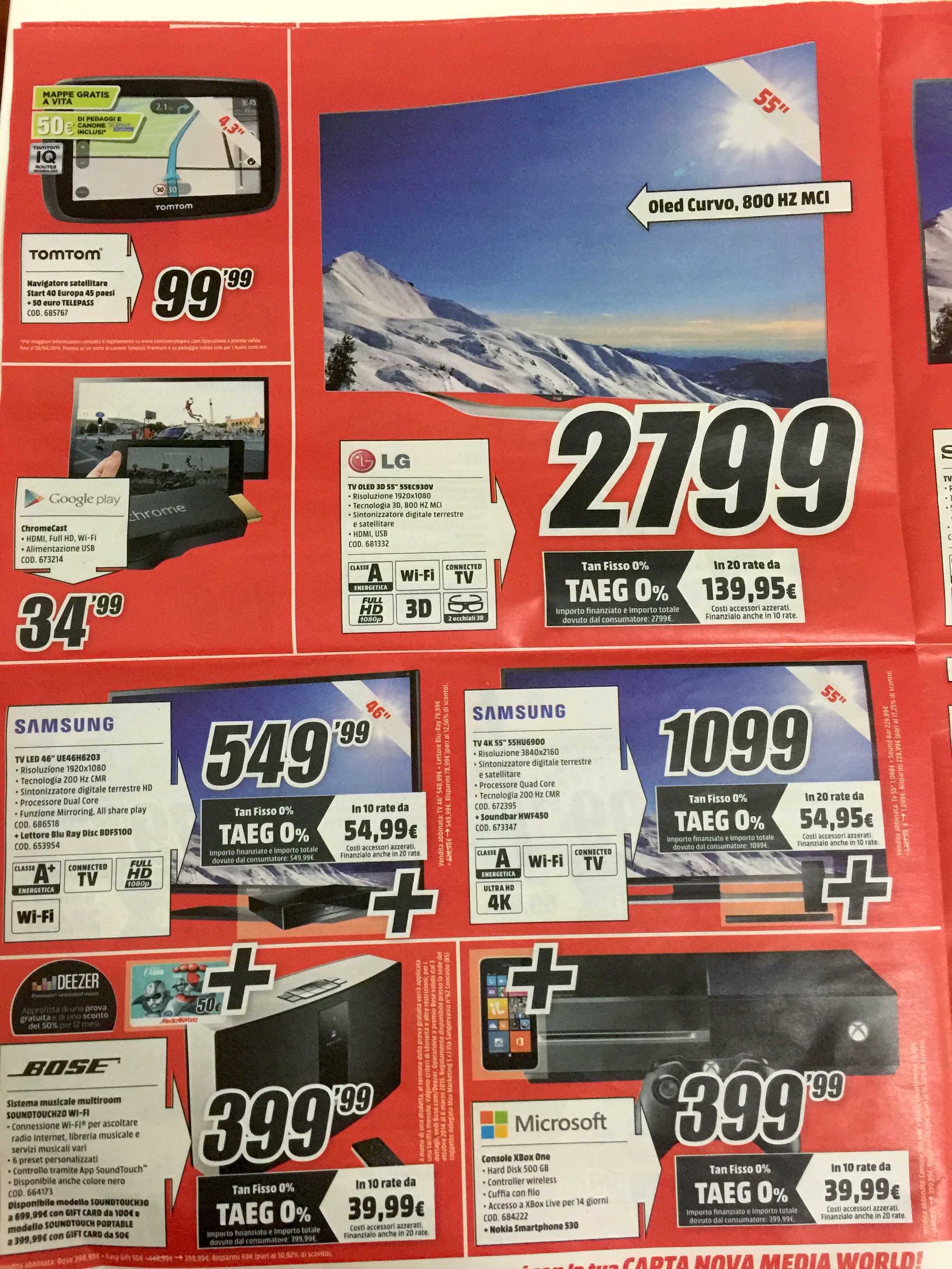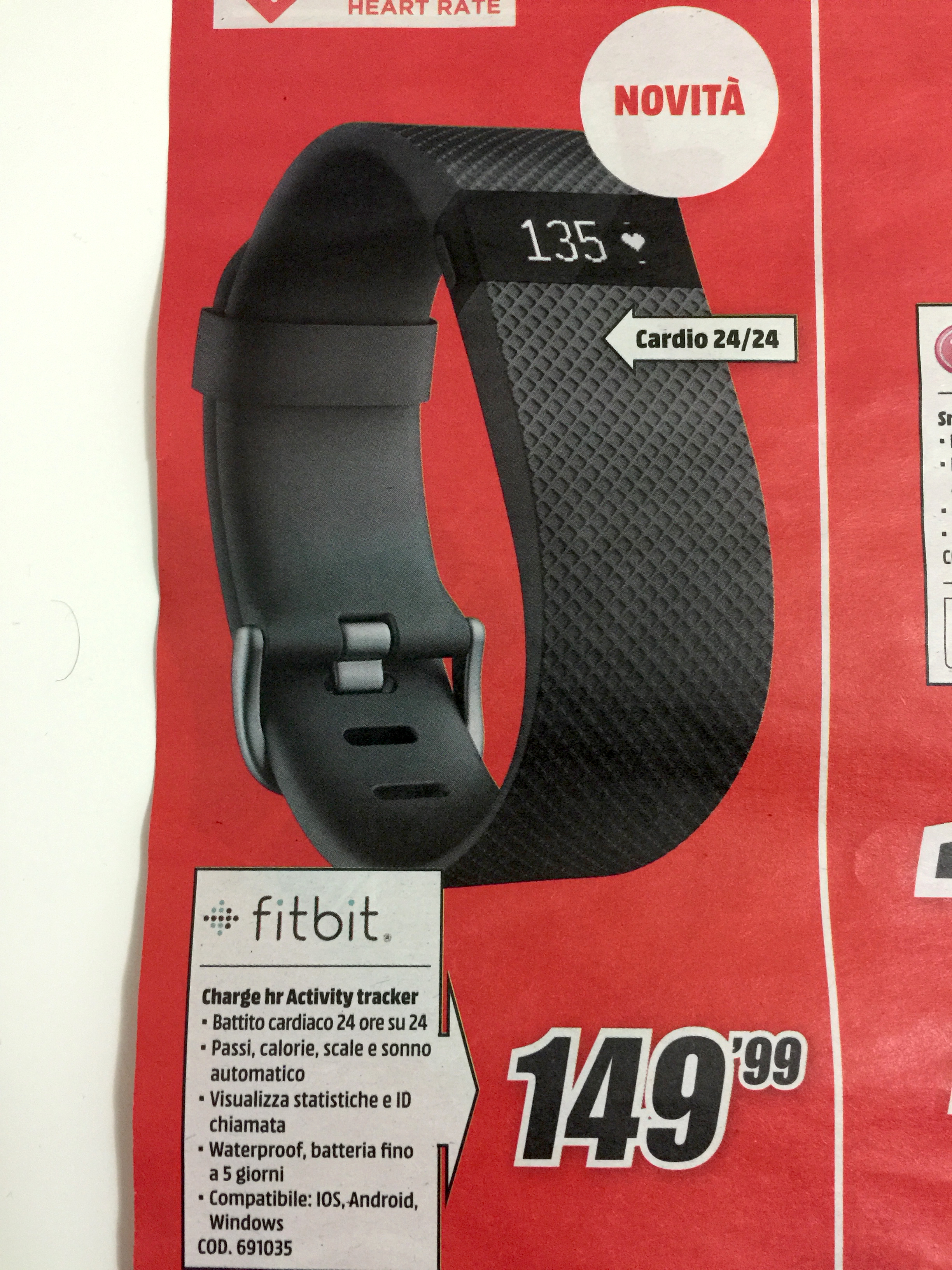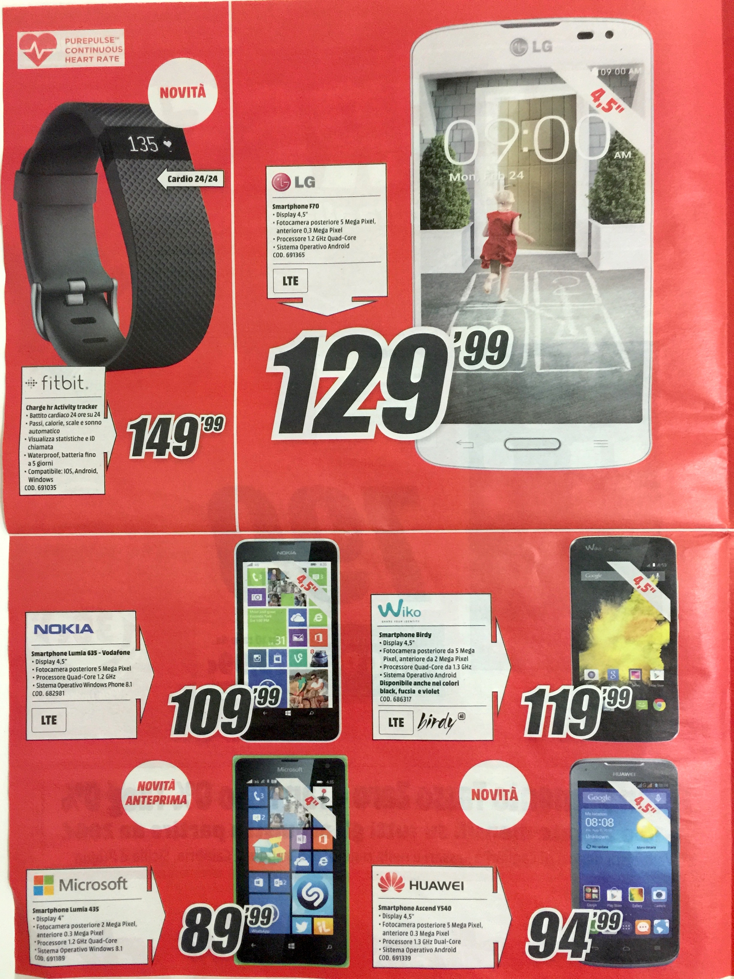Tra gli smartphone troviamo l’LG F70 a 129,99€ e l’Huawei Y340 a 94,99€ mentre in casa Samsung il Galaxy S4 è proposto a 299,99€. Prende posizione a mio parere prezzo qualità il Wiko Birdy a 119,99€. Inoltre Apple Tv a 99,99€. Rimane in top gamma Samsung a 399,99€ lo Smartwatch Gear S. Fit Bit in qualità prezzo non molto eccellenti, sforna Charge hr Activity Tracker a 149,99€.