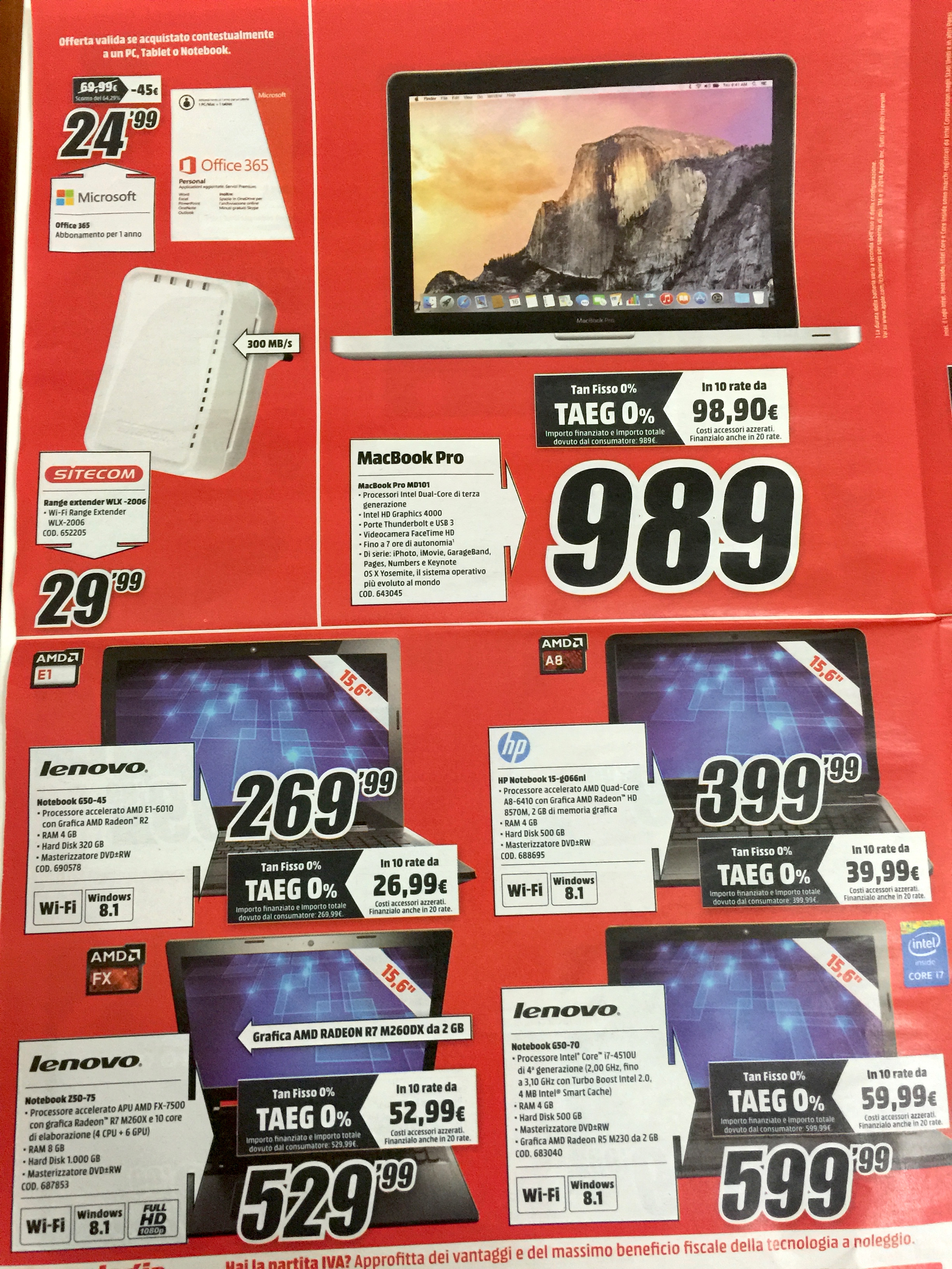 Altre offerte interessanti sono l’ASUS ZenFone 5 a 159,99€ il Samsung Galaxy Tab 4 10.1 a 199,99€ l’ASUS MemoPad 10 3G a 199,99€ che include anche una carta regalo Google Play da 15€. Mediacom X550U a 179,99€, iPad Mini a 199,99€, Samsung Galaxy Trend Plus 89,99€, HP Slate 6 Voice Tab II 219,99€, Chrome Cast a 34,99€. Tre modelli di NoteBook Lenovo da 269,99€ a 599,99€. Inoltre la Console Xbox One a 399,99€ con in regalo un Nokia Lumia 530.