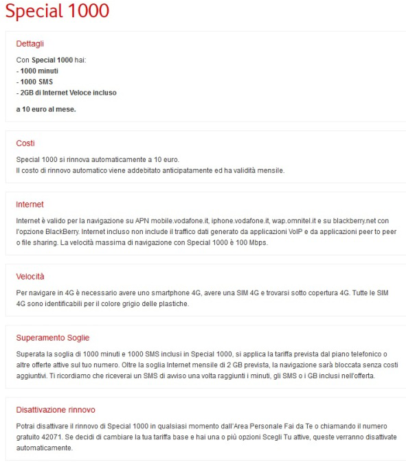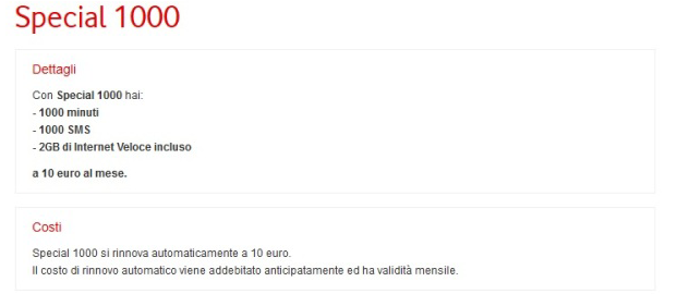 Il pacchetto Vodafone Special 1000 si rinnova al costo di 10 euro al mese ogni 30 giorni, consiste in: