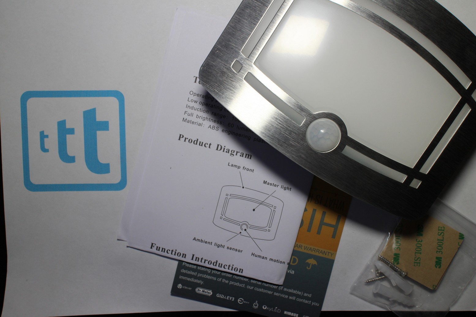 CONFEZIONE In cartone riciclato, contiene oltre alla OxyLED T-03 la manualistica, i tasselli per eventuale fissaggio definitivo e gli adesivi 3M per incollarla ovunque vogliamo.