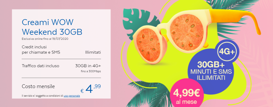 Torna disponibile da ieri e fino al 19 luglio prossimo la promo di PosteMobile Creami WOW Weekend 30 GB, che prevede un bundle illimitato di minuti ed SMS e 30 giga di traffico dati in 4g+ su rete Windtre.