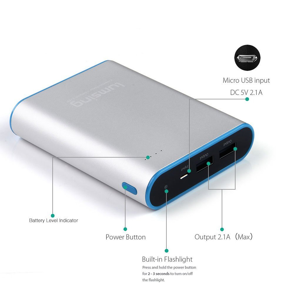 Il prodotto è molto elegante, realizzato in alluminio con i LED che indicano lo stato di carica, due uscite USB per ricaricare due dispositivi contemporaneamente e una torcia al LED che può sicuramente essere utile.