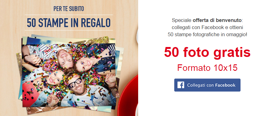 La promozione riguarda una speciale offerta di benvenuto che prevede 50 stampe fotografiche in omaggio ed è valida fino al 22 settembre 2016. Per poterle ricevere vi basterà accedere qui al sito, collegarvi con Facebook, caricare sul sito le foto che siete intenzionati a stampare e decidere se ricevere le foto a casa o ritirarle in negozio!