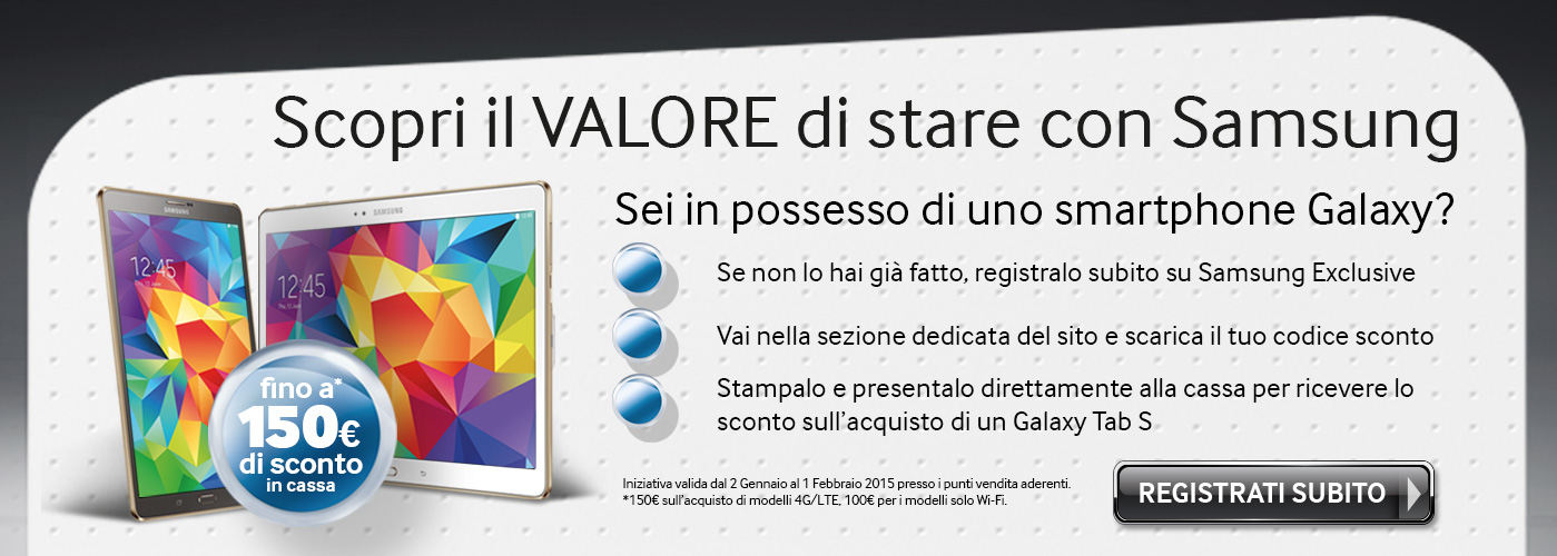 - Se il vostro dispositivo risulterà compatibile con l’offerta in questione, stampare il codice sconto che potrete consegnare direttamente alla cassa dei negozi convenzionati all’acquisto del nuovo Tab S in una delle due misure.