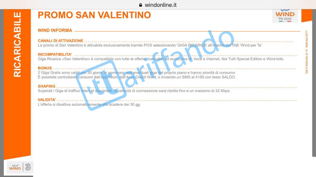 Wind festeggia gli innamorati e a San Valentino omaggia ben 2GB di internet in 4G per 30 giorni a tutti i suoi clienti ricaricabili. L’offerta si potrà attivare presso tutti i Wind Store in modo gratuito, basterà infatti recarsi in uno dei tanti negozi a partire dal 6 Febbraio 2017 e fino al 14 febbraio 2017 e richiederla esplicitamente.