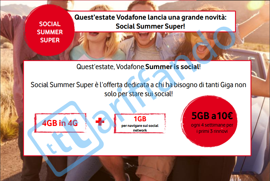 - Social Summer base include 1GB ogni 4 settimane per tre rinnovi, con navigazione inclusa sui social network indicati prima, il tutto ad un prezzo di 5€ una tantum. Dopo i primi 3 rinnovi, Social Summer si rinnova in automatico a 3 euro ogni 4 settimane. C’è da precisare che per i social è prevista una soglia di traffico mensile non conteggiato pari ad 1GB oltre la quale si perdono i benefit dell’offerta.