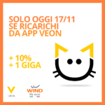 I clienti Wind che effettuano una ricarica su Veon riceveranno il 10% sulla ricarica effettuata fino ad un massimo di 10€ ed 1 GIGA di traffico gratis, da utilizzare entro 4 settimane, sulla numerazione indicata in fase di registazione su VEON.