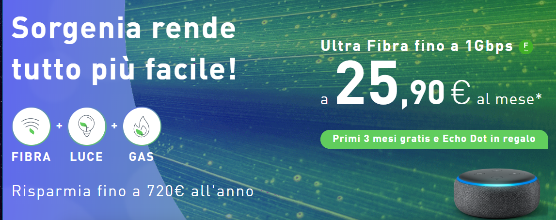 Sorgenia lancia l’offerta Fibra ad 1 Gigabit by OpenFiber: 3 mesi gratis, 0 vincoli ed un Amazon Echo Dot in omaggio. Risparmi anche su Luce e Gas