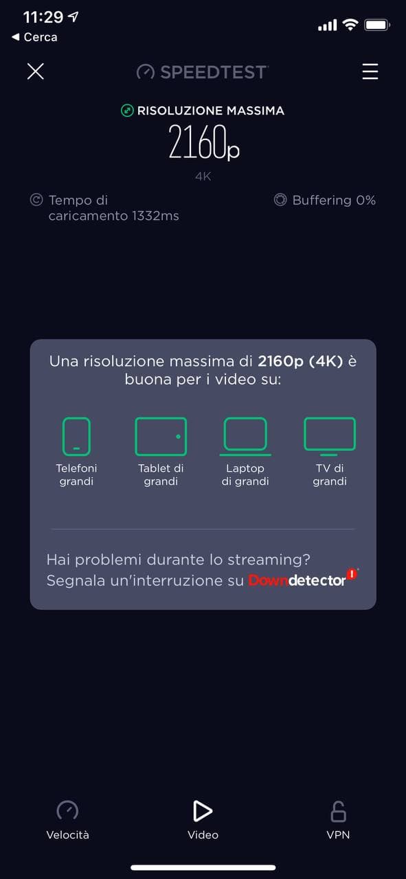 Basterà infatti cliccare in basso su “Video” (dopo aver aggiornato l’app) per avviare un test di streaming utilizzando i bitrate adattivi, molto in uso dai principali fornitori di servizi in streaming come Netflix, YouTube e Prime Video. In pochi secondi l’app ci dirà fino a quale risoluzione massima grazie alla nostra velocità di connessione potremmo guardare video, indicando pure per quali dispositivi questa risulta idonea.