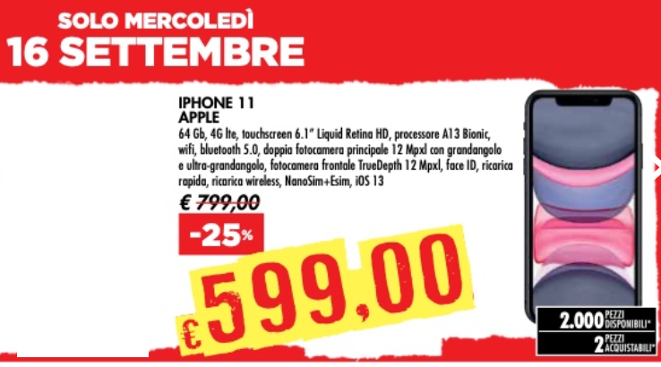 È la star del volantino 14 giorni mai visti e fa sicuramente gola: stiamo parlando dell’iPhone 11 da 64 GB che, esclusivamente nella giornata del 16 settembre 2020, verrà messo in vendita a soli 599 euro, contro un prezzo ufficiale di listino di 839,00 euro.