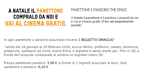 Il prezzo del panettone è di 5.90€ se acquistate due biglietti al box, oppure è possibile acquistare solo il panettone al costo di 6,50€. Vi ricordiamo che i biglietti in omaggio sono validi dal 18 gennaio al 29 febbraio 2016, inoltre non è possibile usufruire dei biglietti in occasione di festività o di sabato e domenica, ma considerando che i biglietti sono gratis, non sarà sicuramente un problema recarsi al cinema in un giorno lavorativo.