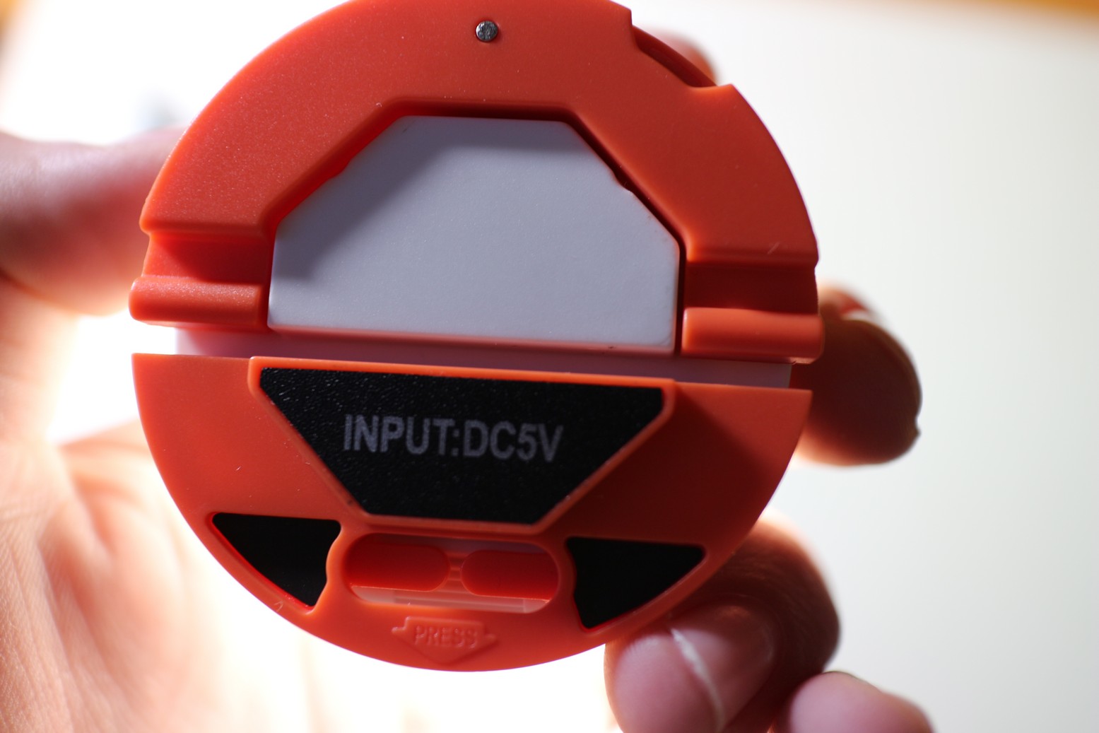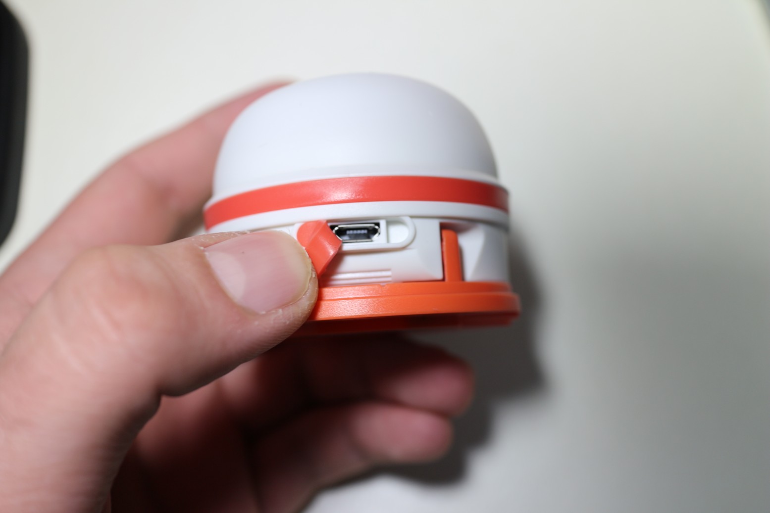 COSTRUZIONE In plastica, quasi impermeabile (viene dichiarato che è protetta dalla pioggia e lo sono anche gli ingressi) con dimensioni pari a 6,1 x 5 x 6,1 cm e appena 70g di peso. Ha solo un pulsante di accensione che ne gestisce anche la luminosità, un ingresso micro USB per la ricarica della batteria interna da 450 mAh e inoltre è possibile sia appenderla grazie al gancio apposito, sia poggiarla sul tavolo grazie al piedistallo estraibile, sia infine incollarla grazie al magnete.