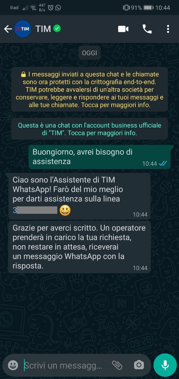 In primo luogo, se volete provare il servizio ma non avete ricevuto l’SMS, vi basterà cliccare su questo link [https//api.whatsapp.com/send?phone=393351237272] e verrete reindirizzati automaticamente alla chat con l’account business di Tim.