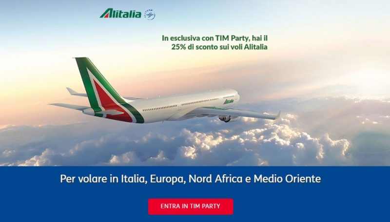 Tra giovedì 31 ottobre e venerdì 1° novembre 2019, i clienti TIM potranno usufruire di un’interessante promozione con Tim Party, il programma di fidelizzazione di TIM lanciato nel maggio 2018. Gli iscritti al programma potranno infatti ottenere un codice sconto del 25% per alcuni voli Alitalia, per viaggi effettuati dal 4 novembre 2019 al 31 marzo 2020 (ultima data di rientro).