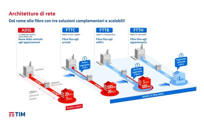 Ieri TIM ha pubblicato sul suo sito ufficiale i suoi impegni e “numeri” per i prossimi tre anni: 12 miliardi di euro di investimento in innovazione, di cui 4,8 miliardi per ultra-broadband e rete mobile. Grazie a questi fondi ed entro il 2018, l’84% delle abitazioni del territorio italiano saranno coperte da reti ultrabroadband, partendo da una buona base del 42%, raggiunta alla fine dello scorso anno. Si parla soprattutto di FTTC (fiber-to-the-cabinet) e FTTH (fiber-to-the-home) che rispettivamente sono in grado di fornire velocità di download massime teoriche di 100 Mbps (in futuro 200 Mbps) e oltre il 200 Mbps (in futuro 1 GBit/s) grazie alla loro scalabilità.