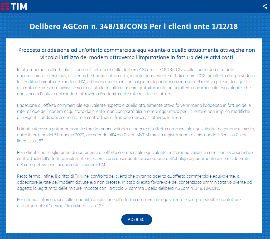 “Resta fermo, infine, il diritto di TIM, nei confronti dei clienti che avranno aderito all’offerta commerciale equivalente, di addebitare le rate del modem dovute e/o non pretese, in caso di esito favorevole del contenzioso amministrativo avente ad oggetto la legittimità delle misure imposte con l’articolo 5, comma 1 della delibera AGCom n. 348/18/CONS.”