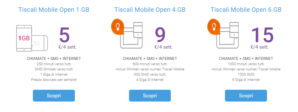 Ci sono novità in casa Tiscali con le nuove promozioni previste per la sezione Mobile: Open 1GB, 4GB e 6GB a partire da 5€ ogni 4 settimane. Vediamole meglio nel dettaglio: