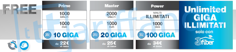 - All-In Power costerà 19€ per i primi 6 mesi, poi 25€ ed offre minuti illimitati, 1000 SMS e Giga illimitati. C’è però da precisare che i Giga Illimitati sono presenti solo in caso in cui il cliente possegga una linea fissa 3Fiber/3ADSL, altrimenti il bundle dati a disposizione sarà di “soli” 100GB (con Giga Bank). Inoltre, è previsto un costo di attivazione di 3€ (nuovi clienti) o di 9€ (già clienti), oltre al 4G che diventerà a pagamento dopo il 31/08/2018 al costo di 1€ al mese. L’offerta è attivabile solo con pagamento su Carta di Credito o Conto corrente bancario.