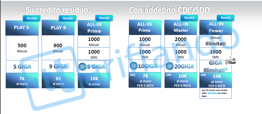 - Nuove Super Internet su credito residuo: 5GB a 6€ al mese e 15GB a 10€ al mese. In entrambi i casi è presente Giga Bank, che preserva i Giga non consumati prima del rinnovo. Costi di attivazione 9€.