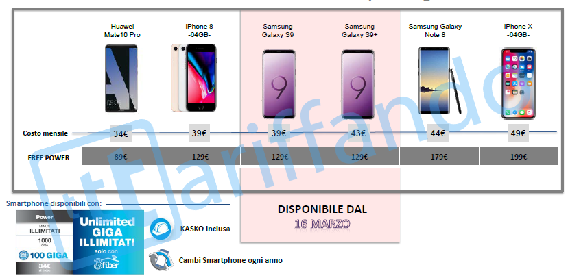 - Free Power costerà invece a partire da 34€ ed è esattamente uguale ad All-In Power: potrete però abbinare uno smartphone a scelta, tra cui, anche i nuovi Samsung Galaxy S9 e S9+.
