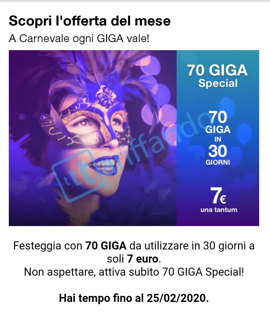 70GB Special è attivabile fino al 25 febbraio 2020. Per ulteriori informazioni, vi invitiamo a leggere i dettagli e condizioni dell’offerta.