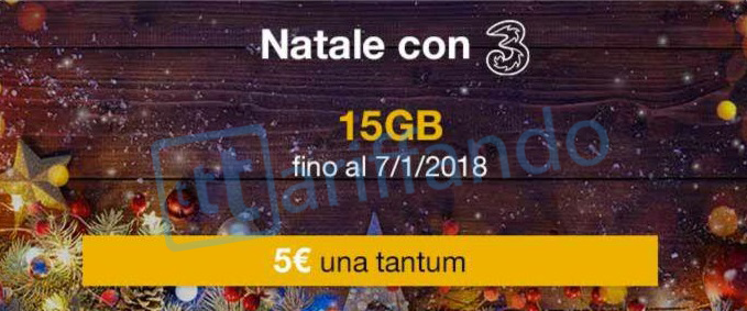 L’opzione Natale con 3 è attivabile soltanto sui piani tariffari Power10, Power15 e Power29. I Clienti che non hanno uno dei piani compatibili con l’opzione, potranno attivare l’opzione solo effettuando il cambio piano gratuito verso Power29. Per maggiori dettagli sulle condizioni del piano Power29 visita il sito tre.itL’opzione Natale con 3 offre 15 GIGA di traffico Internet da utilizzare entro il 7/1/2018 al costo di 5€ addebitato una tantum sul credito standard della SIM.