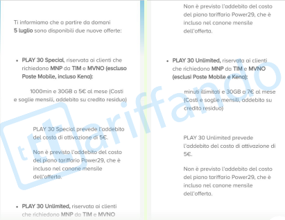 Le offerte di cui parliamo sono la Play 30 Special e la Play 30 Unlimited. Entrambe di tipo winback, si rivolgono ad alcuni nuovi clienti ed ex-clienti del gestore. In particolare sono riservate ai clienti che richiedono la portabilità da TIM e MVNO. Offrono 30 GB di dati, sono attivabili con addebito su credito residuo, senza vincoli contrattuali, dal 5 Luglio 2018. Vediamo le due promozioni nel dettaglio.