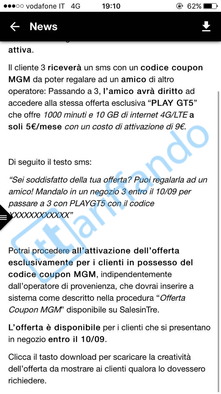 Tre sta inviando alcuni SMS contenenti un coupon ad alcuni clienti con l’offerta Play GT5 attiva. I clienti che hanno ricevuto l’SMS, potranno regalare il coupon a parenti o amici affinché anch’essi possano attivare Play GT5. Se qualche vostro amico o un familiare vi ha regalato il coupon, per attivare l’offerta vi basterà recarvi in un negozio Tre e mostrare il codice. Play GT5 offre per soli 5€ al mese (costo di attivazione di 9€) ben 1000 minuti verso tutti e 10GB di internet.