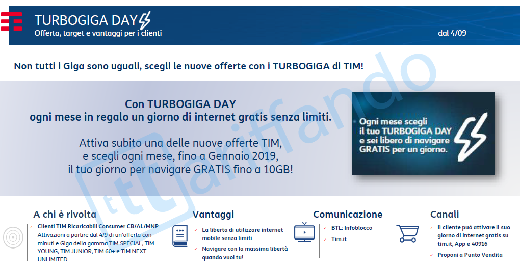 - Entrambe le offerte sopra citate beneficiano di Turbogiga Day, si tratta di un giorno di navigazione al mese solare di internet gratis, abbiamo approfondito questa offerta e trovate qui maggiori dettagli.