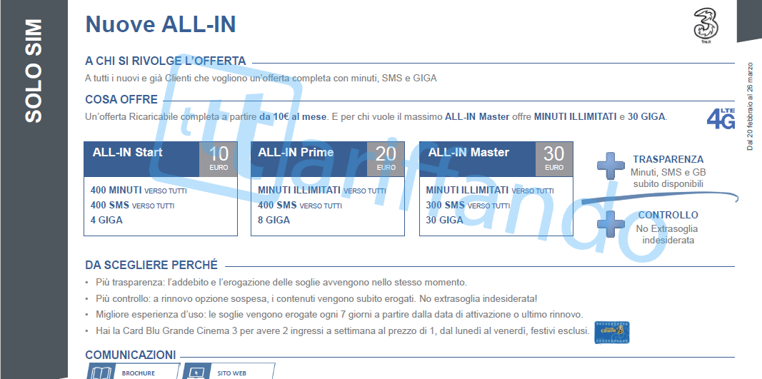 • ALL-IN Start offre, con 10 euro al mese, 400 minuti ed SMS verso tutti e 4 GB di traffico dati;