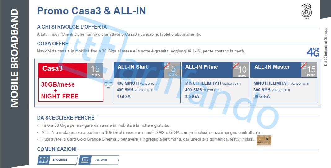 Dedicate a chi vuole dimenticarsi dell’impegno della ricarica, Tre lancia le ALL-IN Start, Prime e Master con Impegno, ovvero con addebito sul conto corrente o carta di credito. I prezzi saranno più bassi, rispettivamente 5, 10 e 15 euro. In questo caso, con ALL-IN Master, la promozione Grande Cinema da diritto alla carta Gold. Le nuove promozioni tutto incluso possono essere attivate a questo prezzo anche con l’acquisto contestuale di un nuovo smartphone, con rate molto piccole, a partire anche da zero o soli due euro al mese.