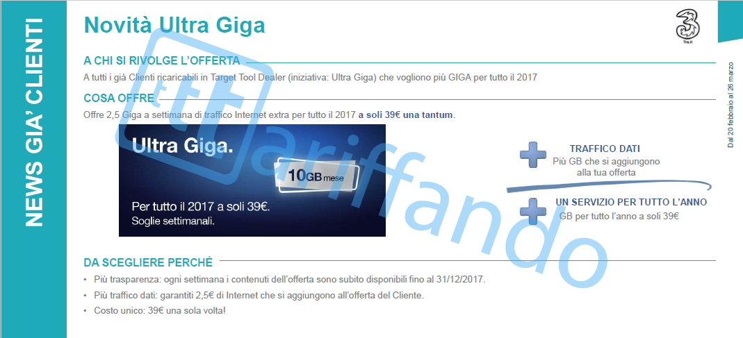 C’è poi Ultra Giga, costa 39€ una tantum, ed offre per tutto il 2017 10GB al mese (soglie settimanali). Sostituisce la promo 100 Giga dello scorso anno, molto apprezzata.