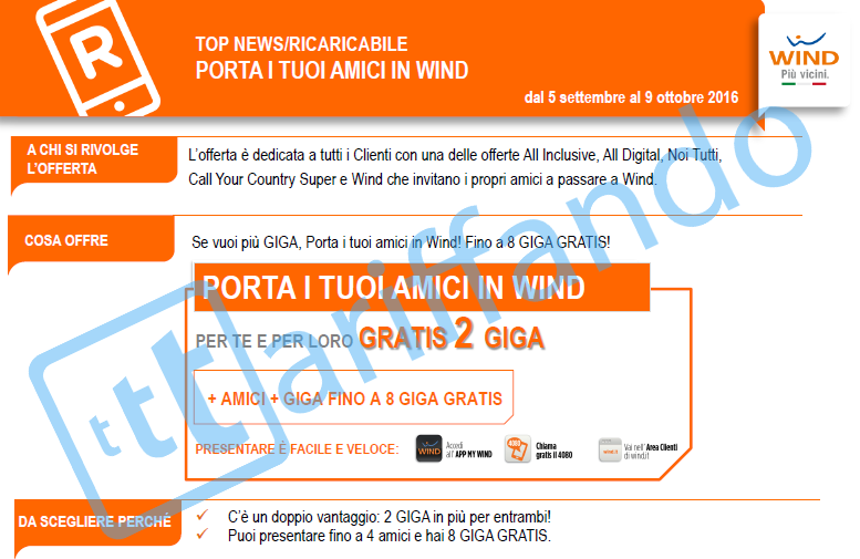 - Porta i tuoi amici in Wind dal 5 settembre al 9 Ottobre 2016 torna la gradita offerta Wind che offre 2GB gratis sia a chi presenta che a chi viene presentato in Wind. Il massimo di Giga accumulabili è pari ad 8GB erogati finchè entrambi i clienti mantengono l’offerta attiva. Quindi fino a 4 amici presentabili per un bonus niente male!