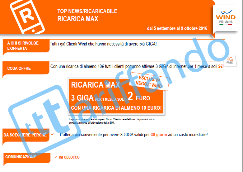 - Ricarica MAX è l’offerta esclusiva dei negozi Wind Italiani, effettuando una ricarica da almeno 10€ si ottengono per 30 giorni ben 3GB in 4GB di internet al costo di 2€ – niente male