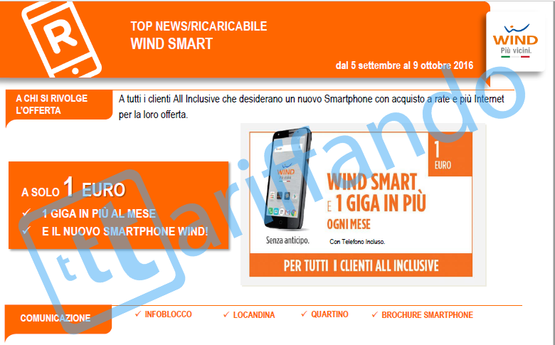 - Wind SMART è un’offerta dedicata ai già clienti con l’offerta All Inclusive: aggiunge il nuovo smartphone di Wind (di cui non sappiamo le caratteristiche tecniche) e 1GB in più al mese ad un costo estremamente vantaggioso, appena 1€ ogni rinnovo! – Sarà interessante scoprire di che smartphone si tratta per valutare meglio l’offerta, che visto il prezzo così basso non si presenta niente male!