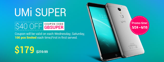 Umi Super è l’ultimo gioiellino del brand cinese, e come i fratelli minori, punta tutto sull’ottimo rapporto qualità/prezzo. Prezzo di listino intorno ai 195,67€, ma il noto store online cinese Gearbest vi permette di ordinarlo ad un prezzo di appena 159€ usufruendo del codice sconto di seguito riportato. Il codice sconto sarà attivo domani 28 Maggio alle 18. Saranno disponibili esclusivamente 100 pezzi.
