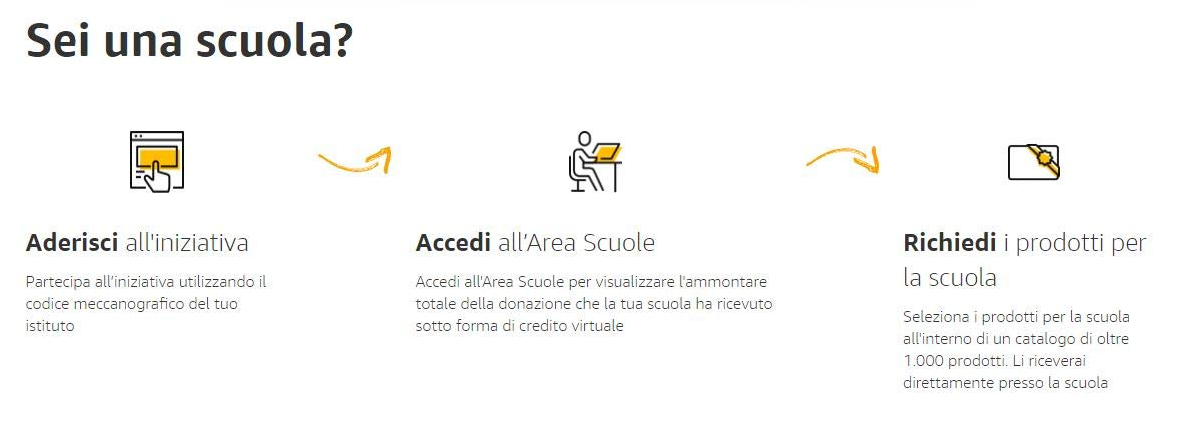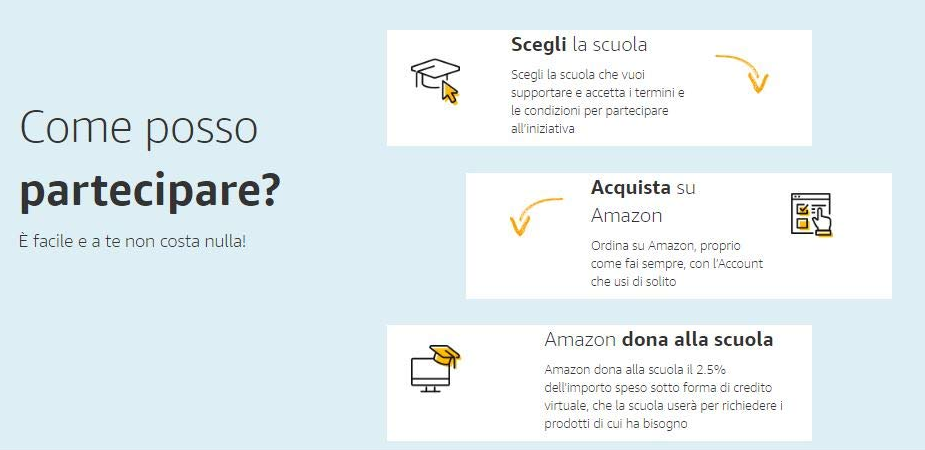 Le scuole che aderiranno all’iniziativa potranno usufruire di un credito virtuale pari ad una percentuale degli acquisti di prodotti venduti e spediti da Amazon. Il credito virtuale accumulato potrà essere usato per richiedere gratuitamente, da un catalogo di oltre 1000 prodotti, attrezzature elettroniche, articoli sportivi, cancelleria, strumenti musicali, giochi, complementi d’arredo e accessori vari.