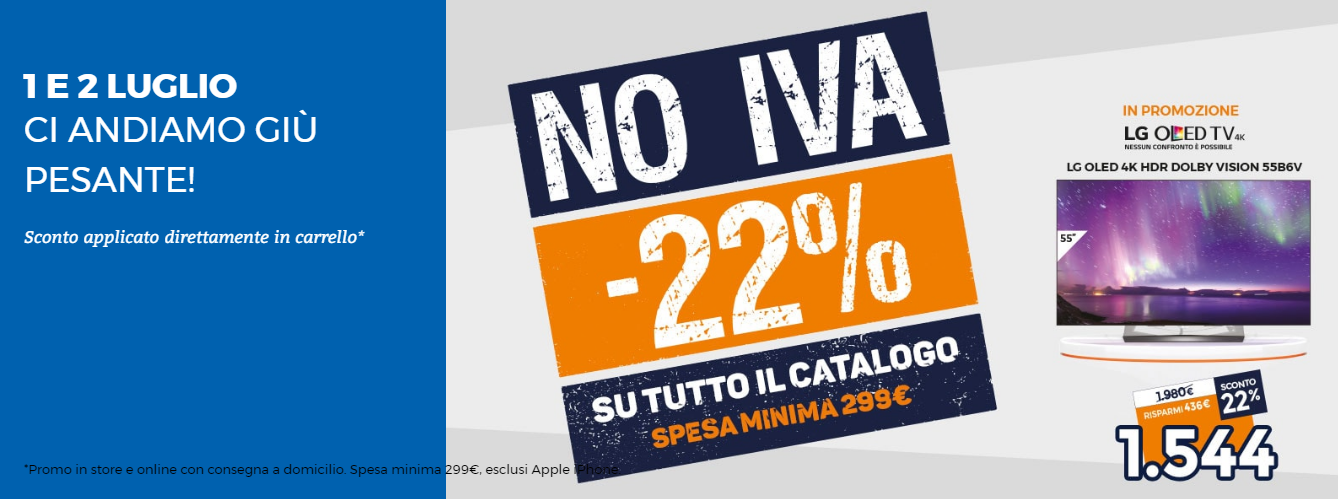 Ovviamente Unieuro impone una soglia minima di acquisto pari a 299€ per poter usufruire di tale sconto, che viene applicato – come detto – direttamente “in carrello” nel caso in cui l’acquisto sia effettuato online. Anche i prodotti Apple sono soggetti a tale promozione, fatta eccezione per gli iPhone su cui l’IVA sarà applicata normalmente. Le offerte sono strettamente legate alla disponibilità del prodotto sia in negozio fisico che online, conviene pertanto affrettarsi se si vuole sfruttare questa possibilità. Ricordiamo infine che la promozione è valida solo per questo weekend.