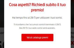 Recandosi sullo stesso sito ieri, invece, non appena entrati nella sezione Vodafone Happy relativa ai premi, Vodafone avvertiva i suoi clienti che, nonostante la raccolta premi fosse terminata come già detto il 28 Febbraio, è possibile scegliere il premio desiderato entro il 29 Marzo 2018, data oltre la quale i sorrisi saranno azzerati.
