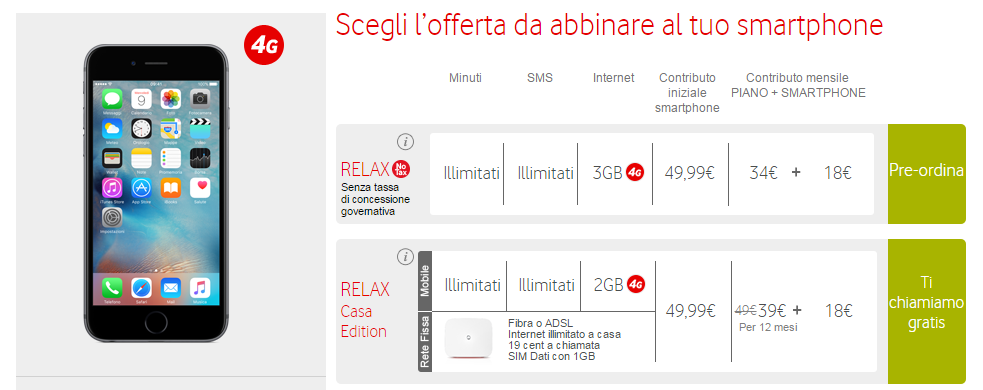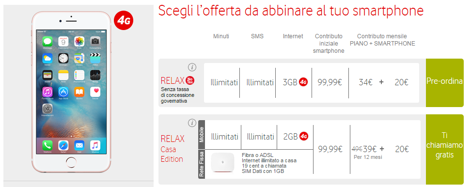 Per terminare, come ultima possibilità, Vodafone vi offre l’occasione di fare vostro un iPhone 6s o iPhone 6s Plus in soluzione unica con SIM card. In questo caso, iPhone 6s da 16GB viene venduto a 789.99 euro, 100 euro in più per la versione da 64GB, 899.99 euro per iPhone 6s Plus da 16GB e 1009,99 euro per la versione da 64GB.