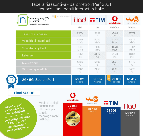 Secondo i test condotti da nPerf, Vodafone nel 2021 ha offerto la migliore connessione mobile in Italia. Per il quarto anno consecutivo, Vodafone è in cima al podio di nPerf con 77.052 punti, seguita da WindTre (68.412 punti), TIM (65.996 punti) e Iliad (58.929 punti).