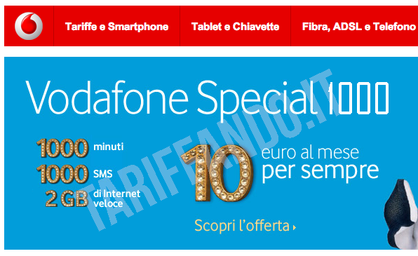 Vi ricordiamo che il pacchetto Vodafone Special 1000 si rinnova al costo di 10 euro al mese ogni 30 giorni, consiste in: