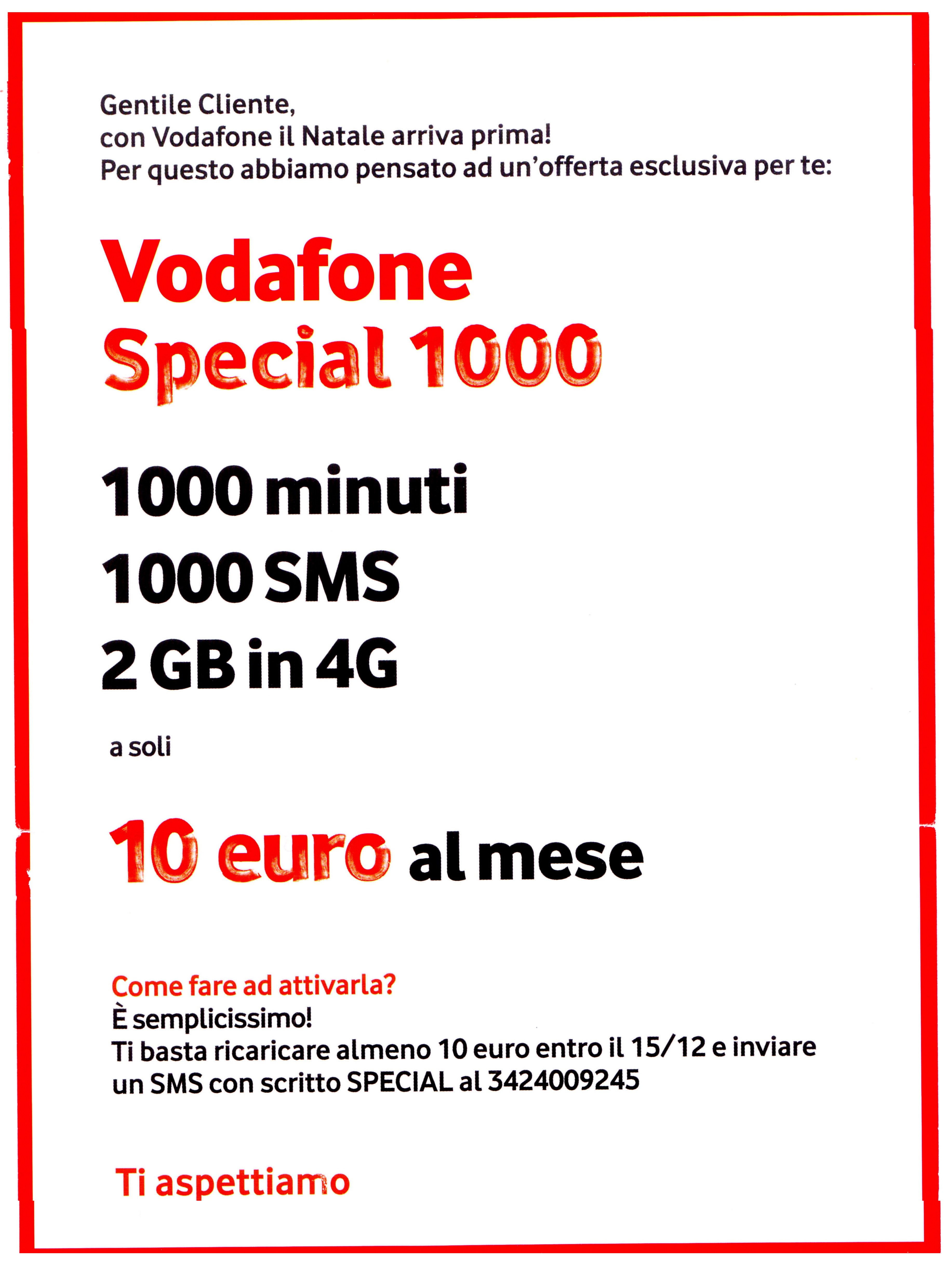 Vi ricordiamo che il pacchetto Vodafone Special 1000 si rinnova al costo di 10 euro al mese ogni 30 giorni, consiste in: