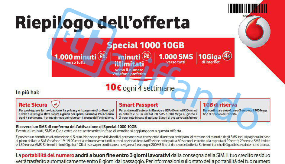 Vodafone Special 1000 10GB è un’offerta che al costo di 10€ ogni 4 settimane offre:
