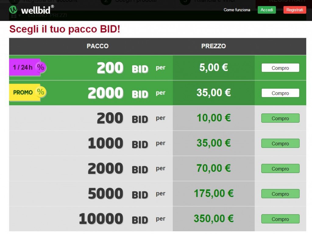 Wellbid, sito di aste al centesimo cipriota, ci da la possibilità di vincere tantissimi prodotti a partire da.. 1 cent! Il portale, presente in tutta Europa, nelle Americhe e in Australia, è un classico sito di aste al centesimo, nel quale l’utente si aggiudica le aste rilanciando tramite BID. I BID sono acquistabili a partire da un pacchetto minimo di 200 (al costo di 10€) fino ad un massimo di 10.000 BID (al costo di 350€). Spesso però ci sono pacchetti promozionali allettanti, come quelli mostrati in figura da 2.000 BID al costo di 35€ o da 200 BID al costo di 5€!